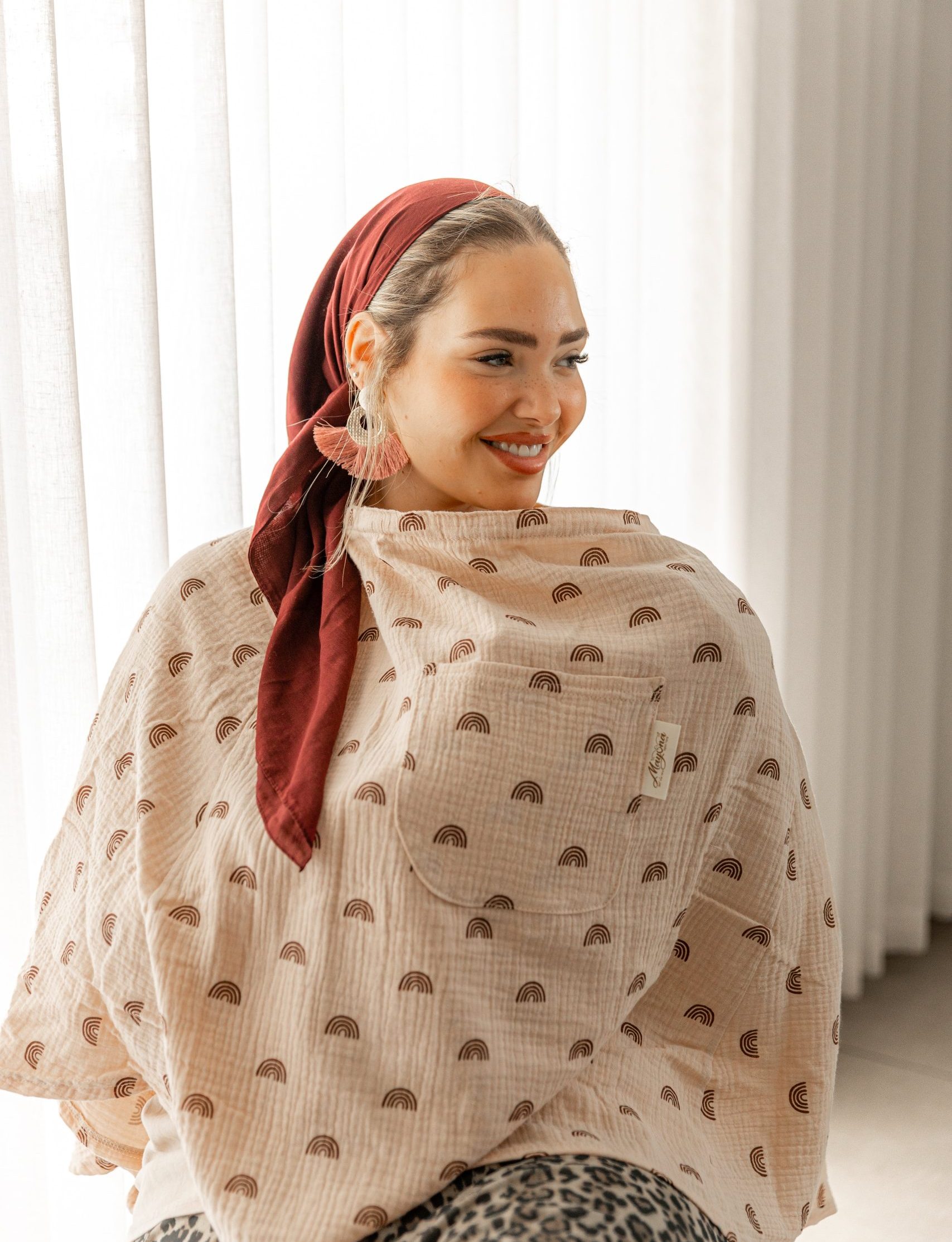 סינר טטרא מחמיא ומיוחד בגוון גוף עדין עם דוגמת קשתות בצבע חמרה. הסינר עשוי טטרה איכותית ואוורירית, בעיצוב עכשווי ונכון. בואי להרגיש בנוח בתוך בד שאת והתינוק שלך כבר מכירים וגם להרגיש את הנשיות העדינה שלך כשאת עטופה ביופי המיוחד של זה